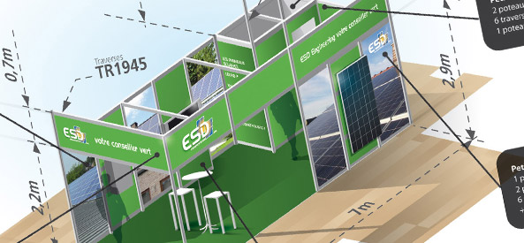 Stand ESD : Voilà le type de projet qui au premier abord pourrait sembler purement technique et qui pourtant me plaît beaucoup. Modéliser en 3 dimensions un stand construit à partir de modules Fesial. Projet commandé par la société Kool Katz.