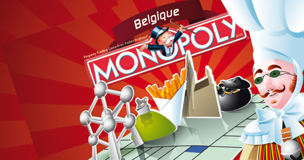Monopoly Belgique: Pré-Avant-projet de visuel pour le jeu Monopoly Belgique... classé sans suite pour des raisons de gestion complexe des droits sur l'Atomium... Ce sont finalement des photos qui seront utilisées.